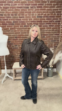 Look and feel your best in this brown Concho and Studs Genuine Leather Jacket by Cripple Creek. This 100% genuine leather jacket features zipper closure, silver studded accents, adjustable zipper cuffs, and whip stitch details resulting in a stunning look for all. Enjoy comfort and warmth with the lined interior and two welt hand warmer pockets with zip closures. Show off your style with antiqued silver studs and concho design throughout.