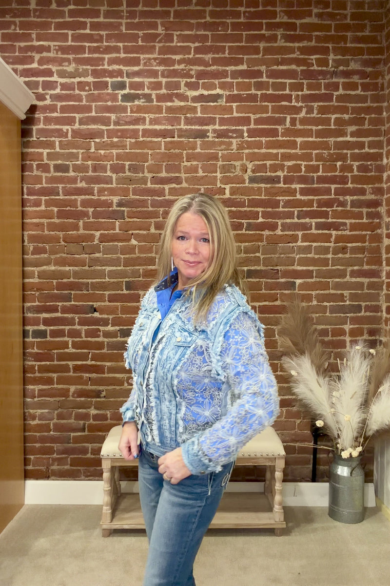 This denim and lace jacket exudes feminine detail. Featuring a light wash denim body with raw hems, paired with delicate white mesh insets adorned with silver metallic and organza embroidered flowers. The mix of textures adds a unique 3D touch, making it the perfect layering piece to brighten up any outfit.