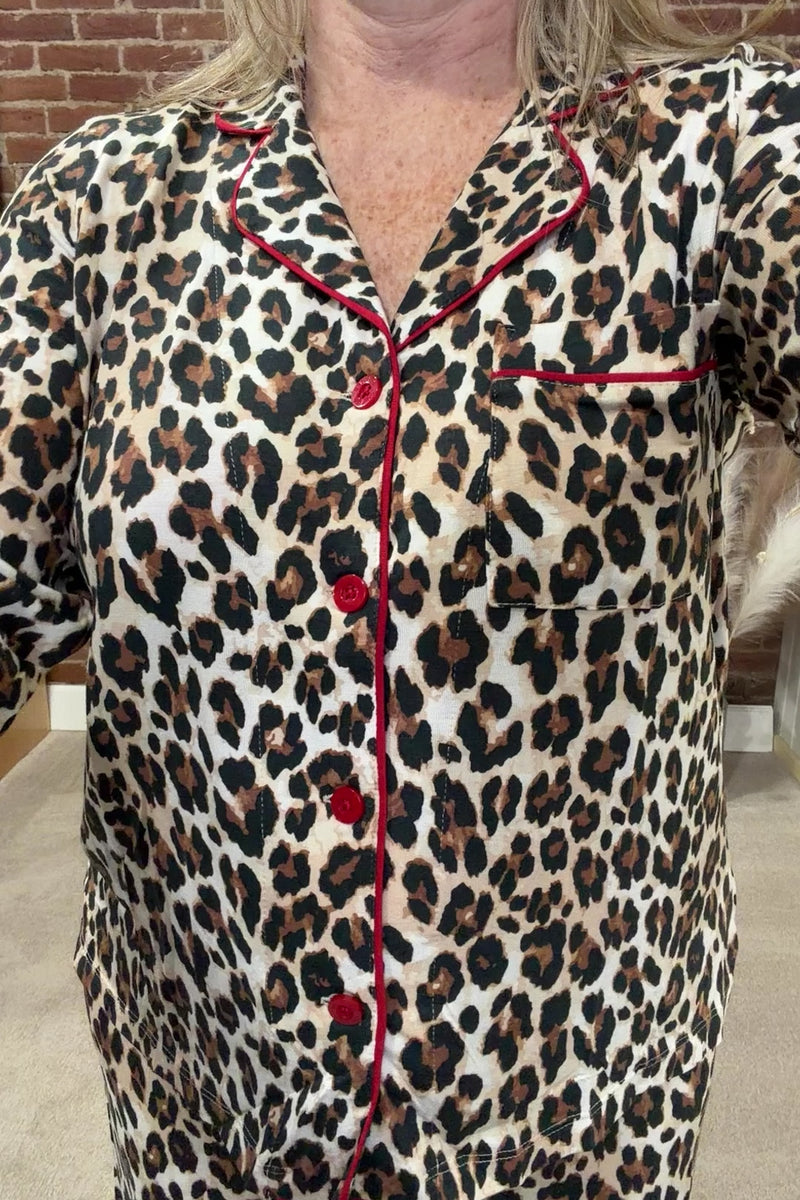 Holiday Dreams PJ Set brings a spicy edge to cozy nights. Featuring a timeless leopard print with bold red piping, this two-piece set includes a long-sleeve classic button up top and drawstring pants made for lounging in style. Soft, lightweight, and effortlessly chic — it’s comfort with a wild side.