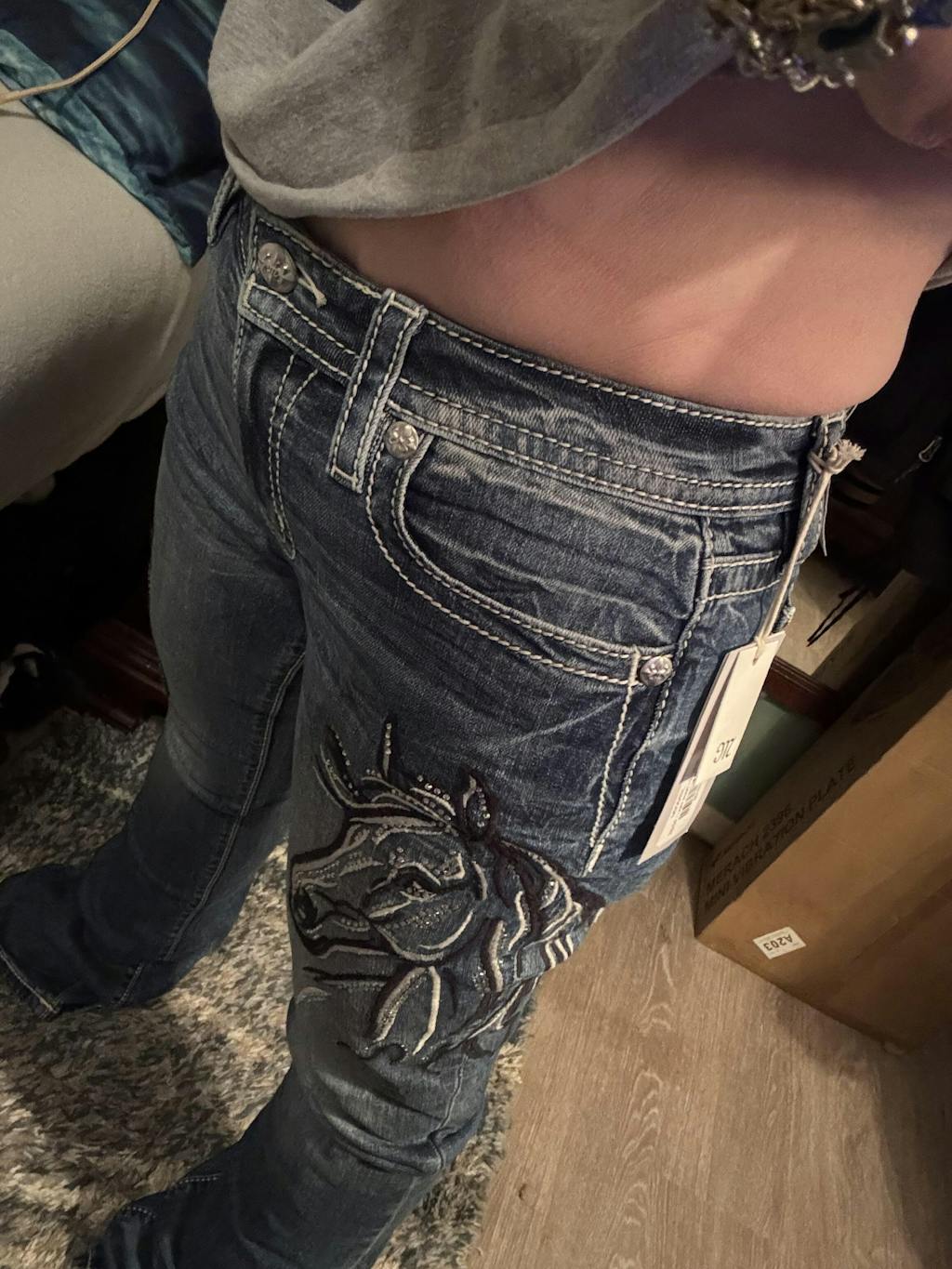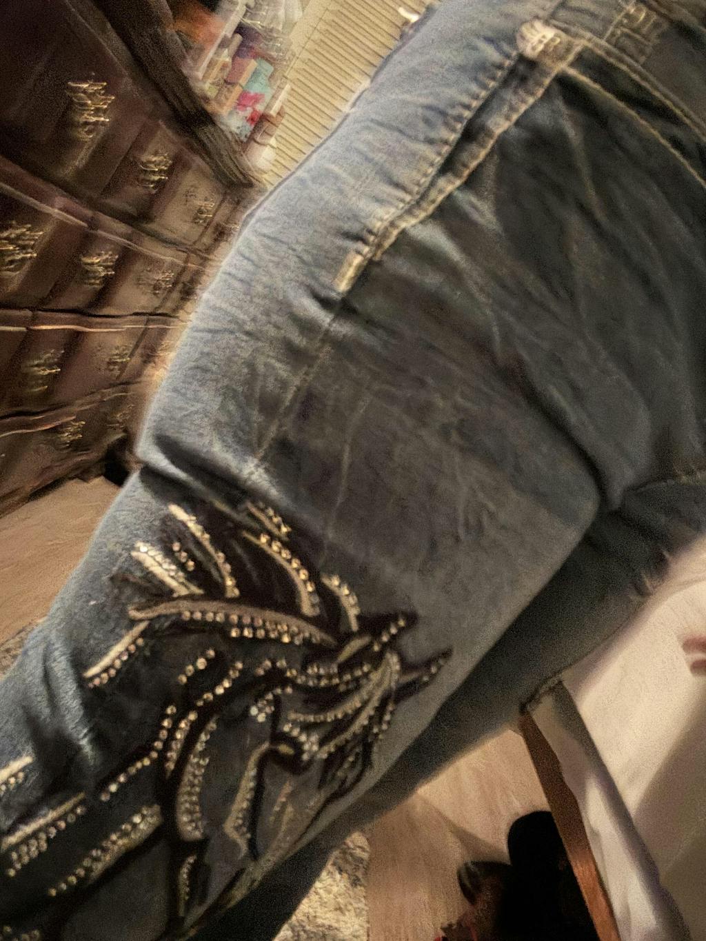 Turn heads in The Midnight Rodeo Jeans along with a show-stopping touch to classic Western style. Designed in a flattering mid-rise bootcut, these statement jeans feature black and silver embroidered flowing horse designs accented with crystal studs running down each leg for a bold, high-contrast look. Finished with a sleek fit and timeless silhouette, they’re made for the woman who loves her denim with a little drama and a lot of shine.