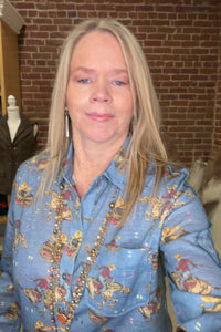 The allover rodeo print—complete with cowboys, horses, and western hats—adds personality to the denim blue base, while the soft, breathable fabric makes it perfect for everyday wear. Pair it with jeans and boots or layer it over a tank for an easy, laid-back western look.