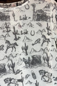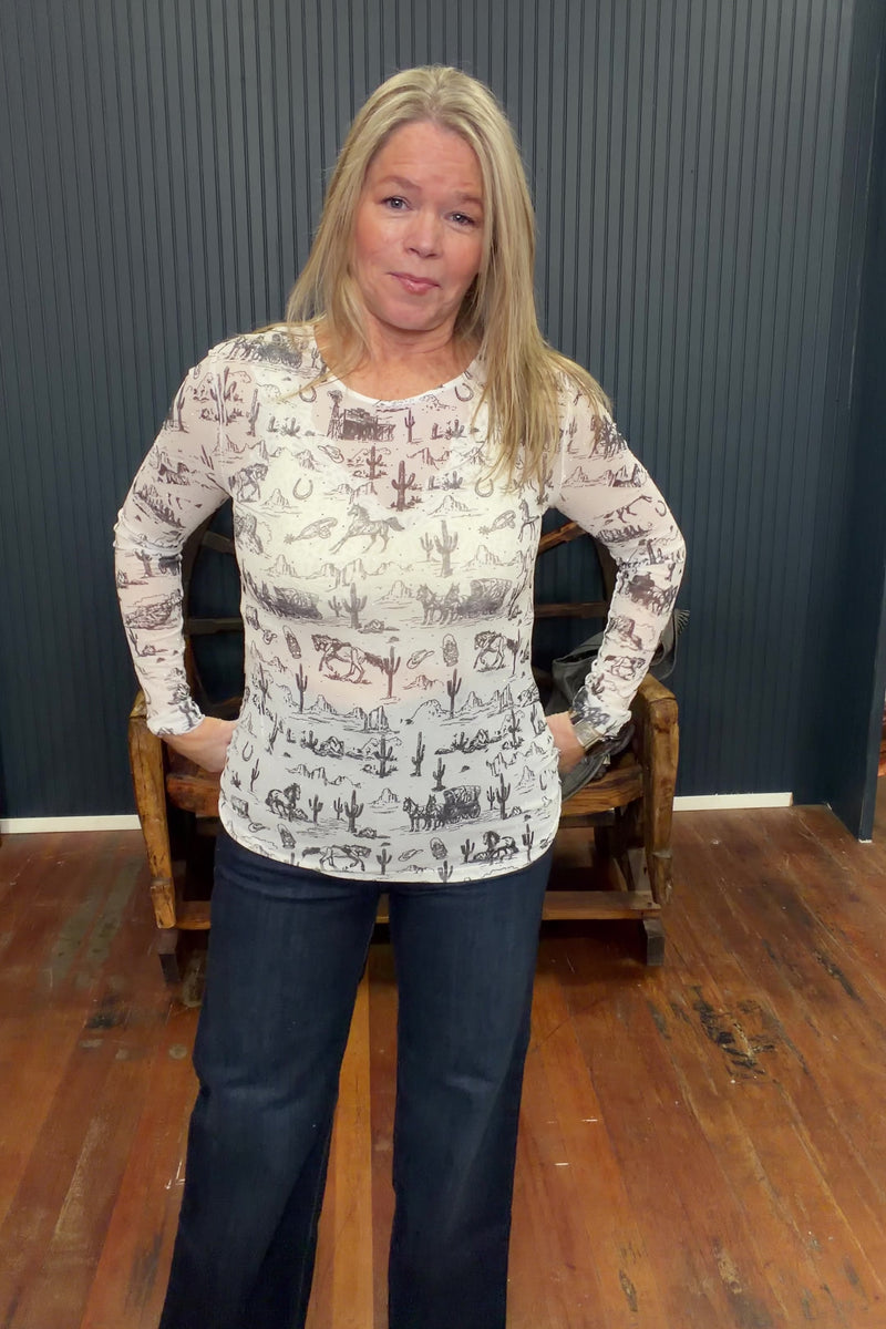 Light, dreamy, and just the right amount of shimmer ✨ This long sleeve black and white mesh top features OLD WEST charm with western motif and subtle sparkly details throughout for a soft, elevated glow. The lightweight sheer design makes it perfect for layering over bralettes, tanks, or under your favorite graphic tees and jackets.