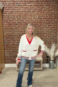 Classic with a patriotic twist đ¤ This American Flag Striped Trim Cardigan is the perfect lightweight layer with standout detail. Featuring a flattering V-neckline, button-front closure, and soft knit feel, itâs cozy without being bulky and easy to style year-round.